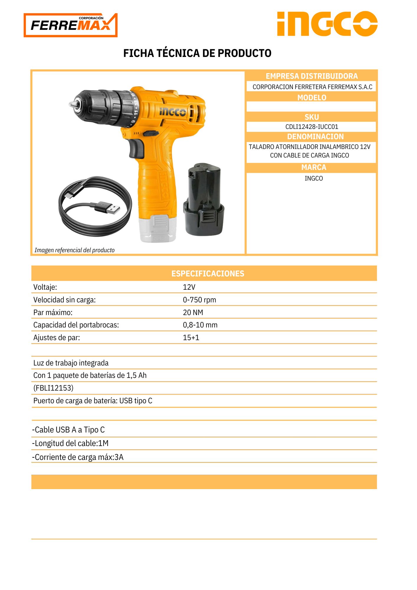 Taladro atornillador 12v con cable de carga ingco