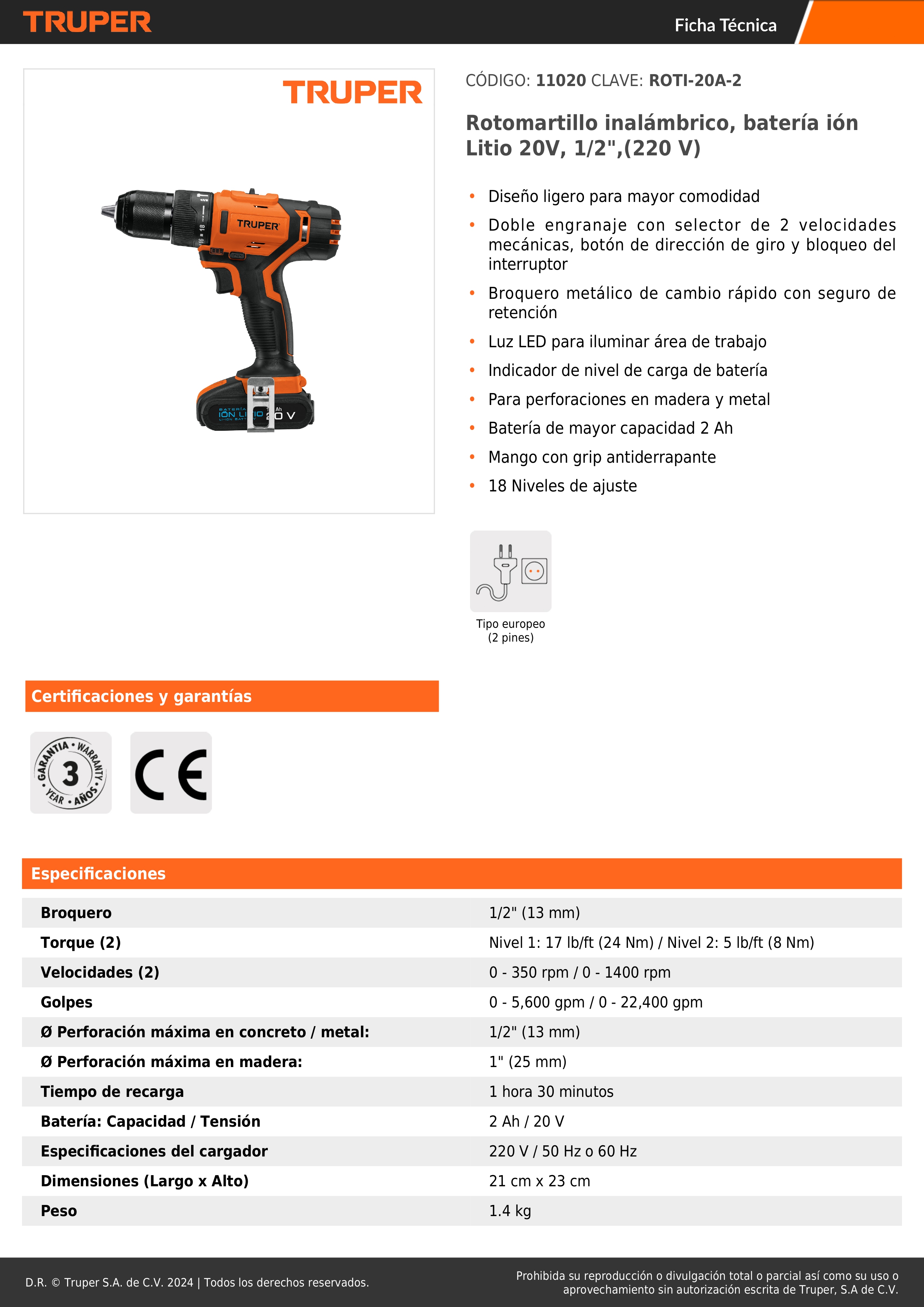 Taladro percutor 1/2" inalámbrico 20 v batería ion litio Truper