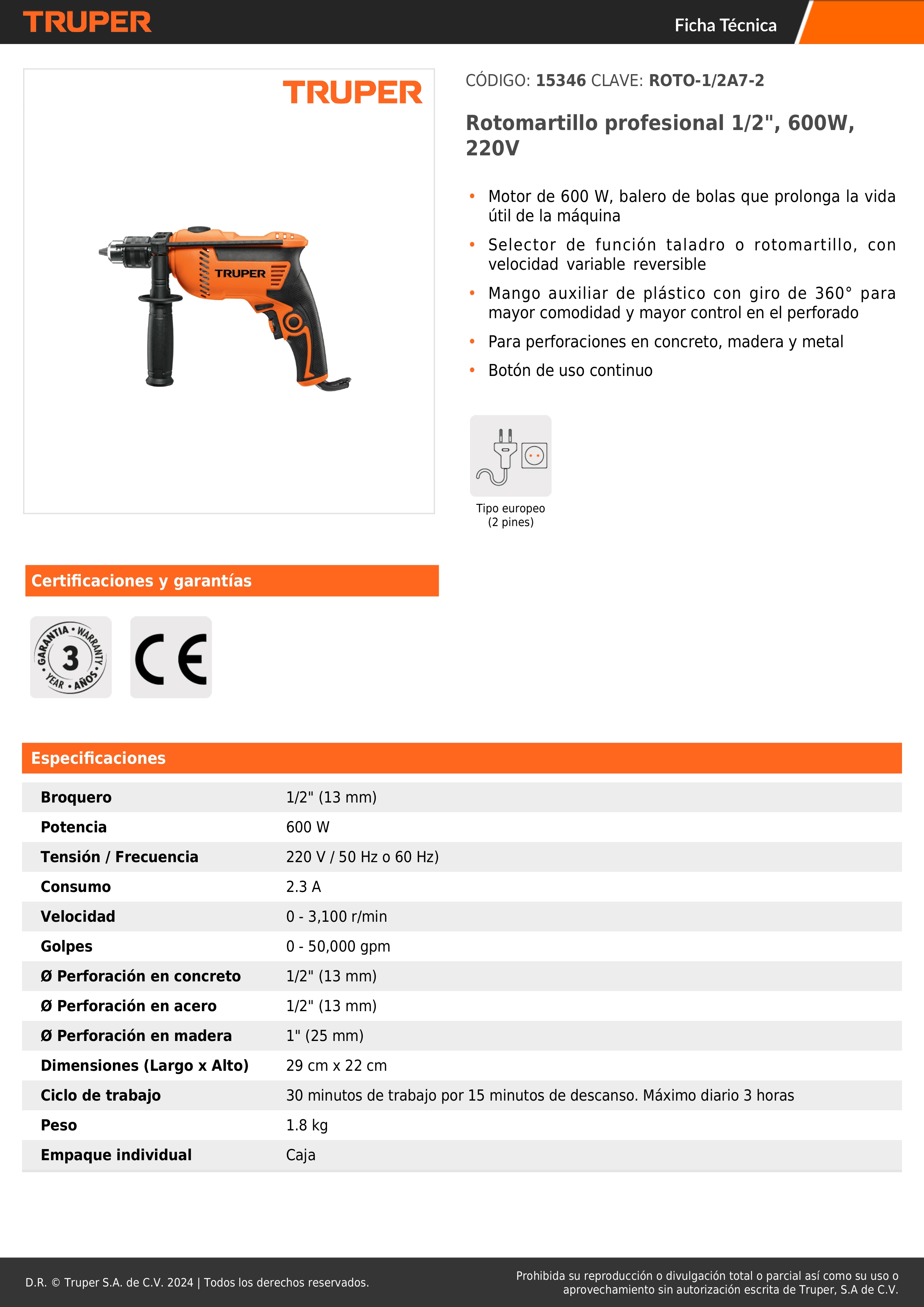 - Selector de función taladro o rotomartillo, con velocidad variable reversible