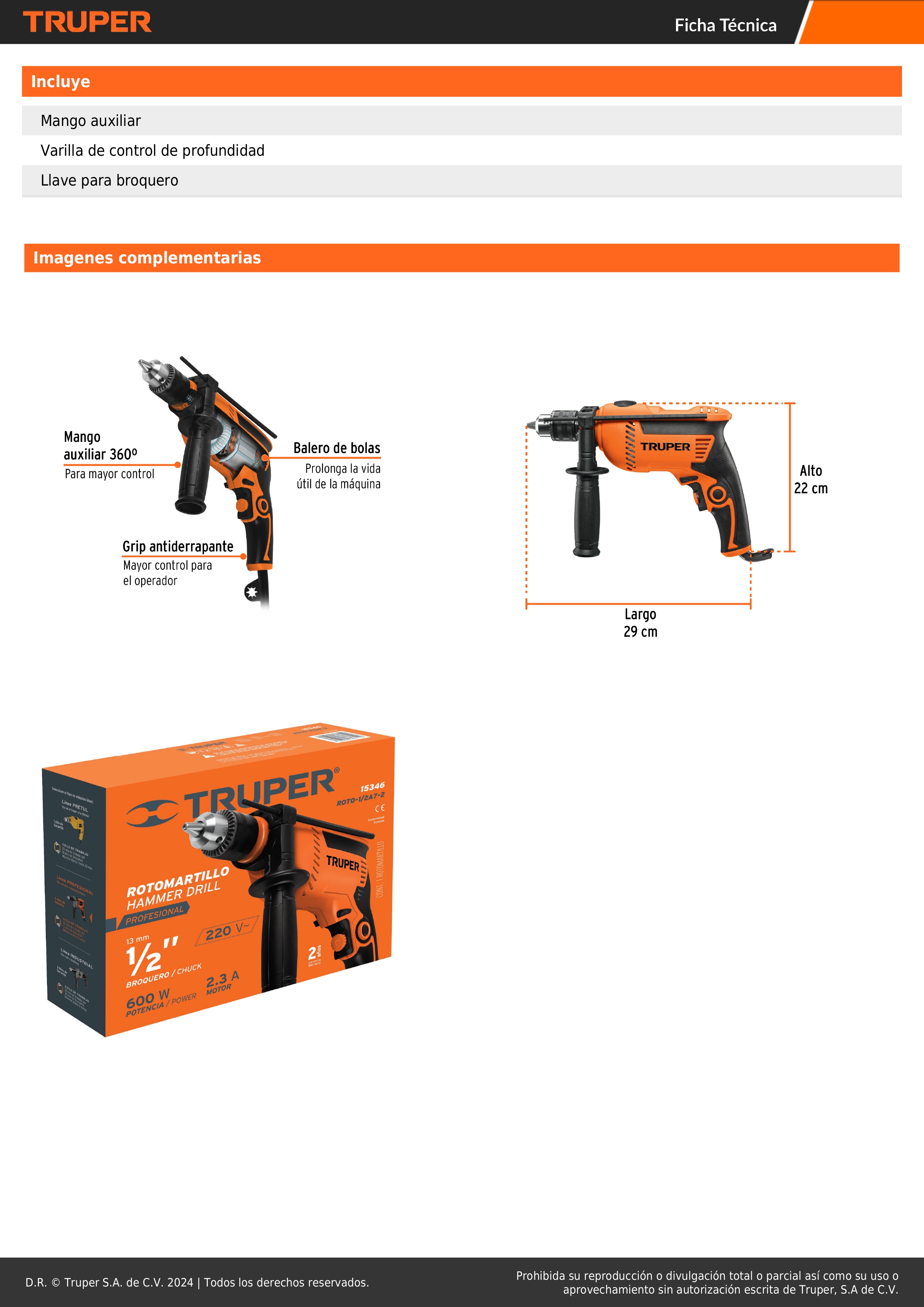 - Mango auxiliar de plástico con giro de 360° para mayor comodidad y mayor control en el perforado