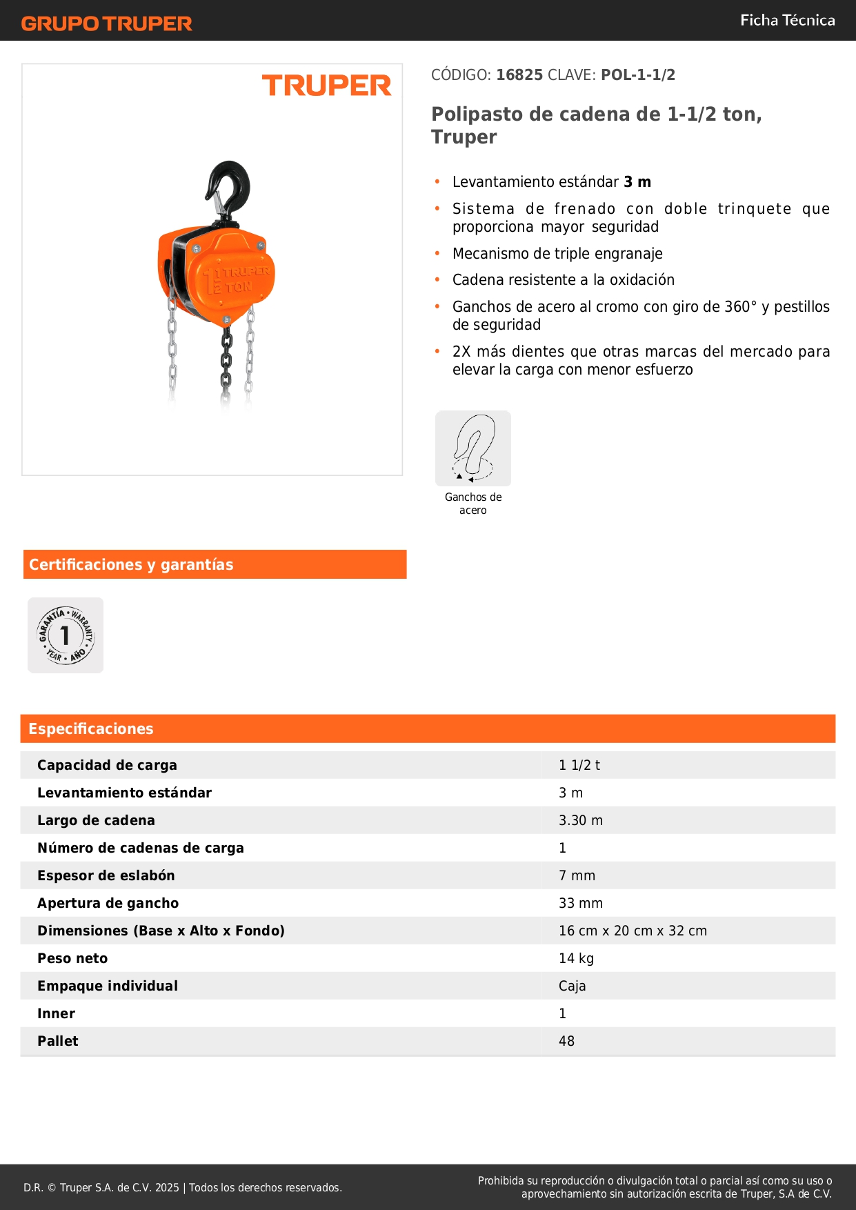 Tecle con cadena de 1 1/2 tonelada Truper