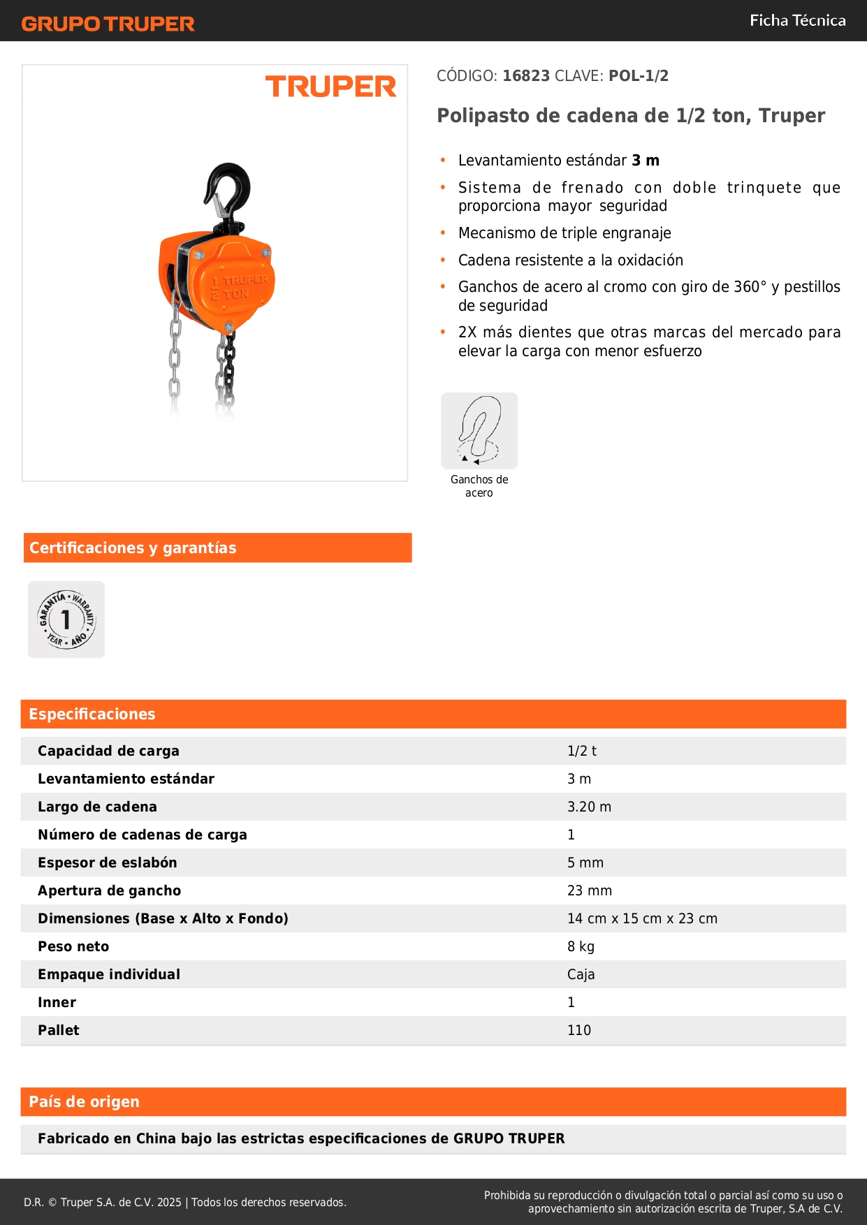 Tecle con cadena de 1/2 tonelada Truper