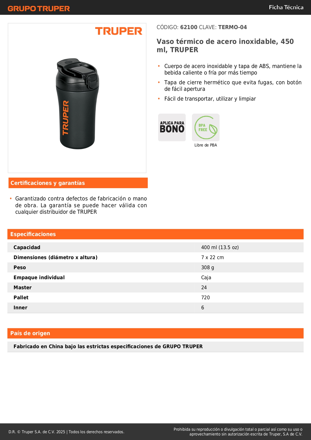 • Cuerpo de acero inoxidable y tapa de ABS, mantiene la bebida caliente o fría por más tiempo