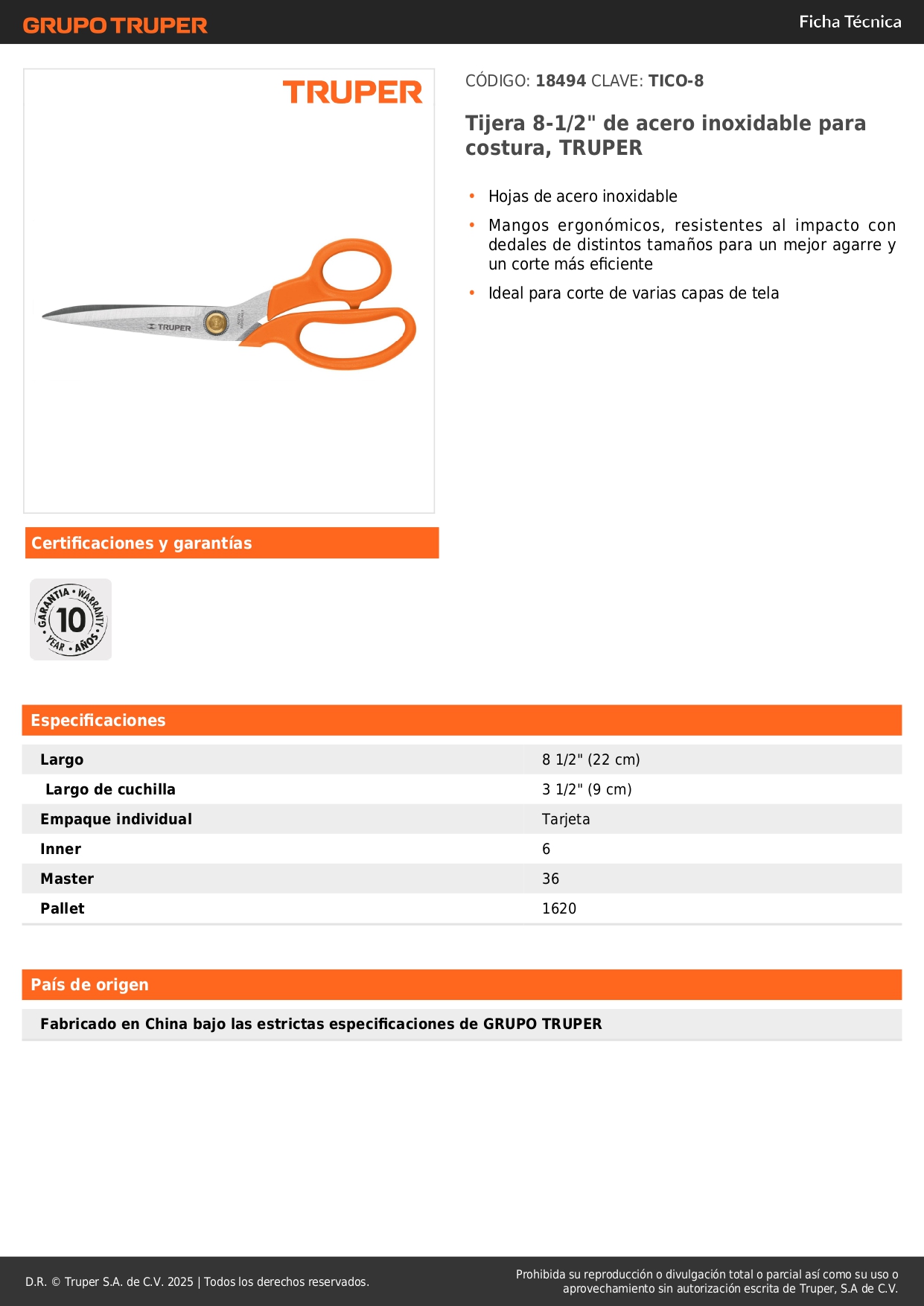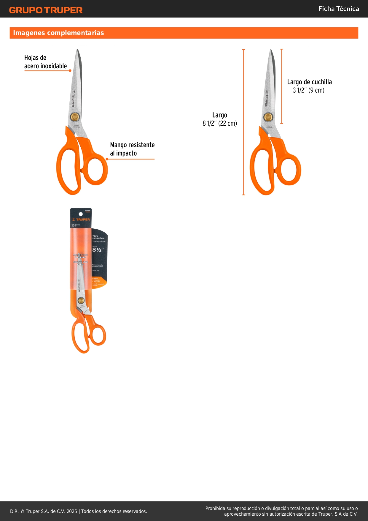 Tijera 8-1/2'' de acero inoxidable para costura. truper