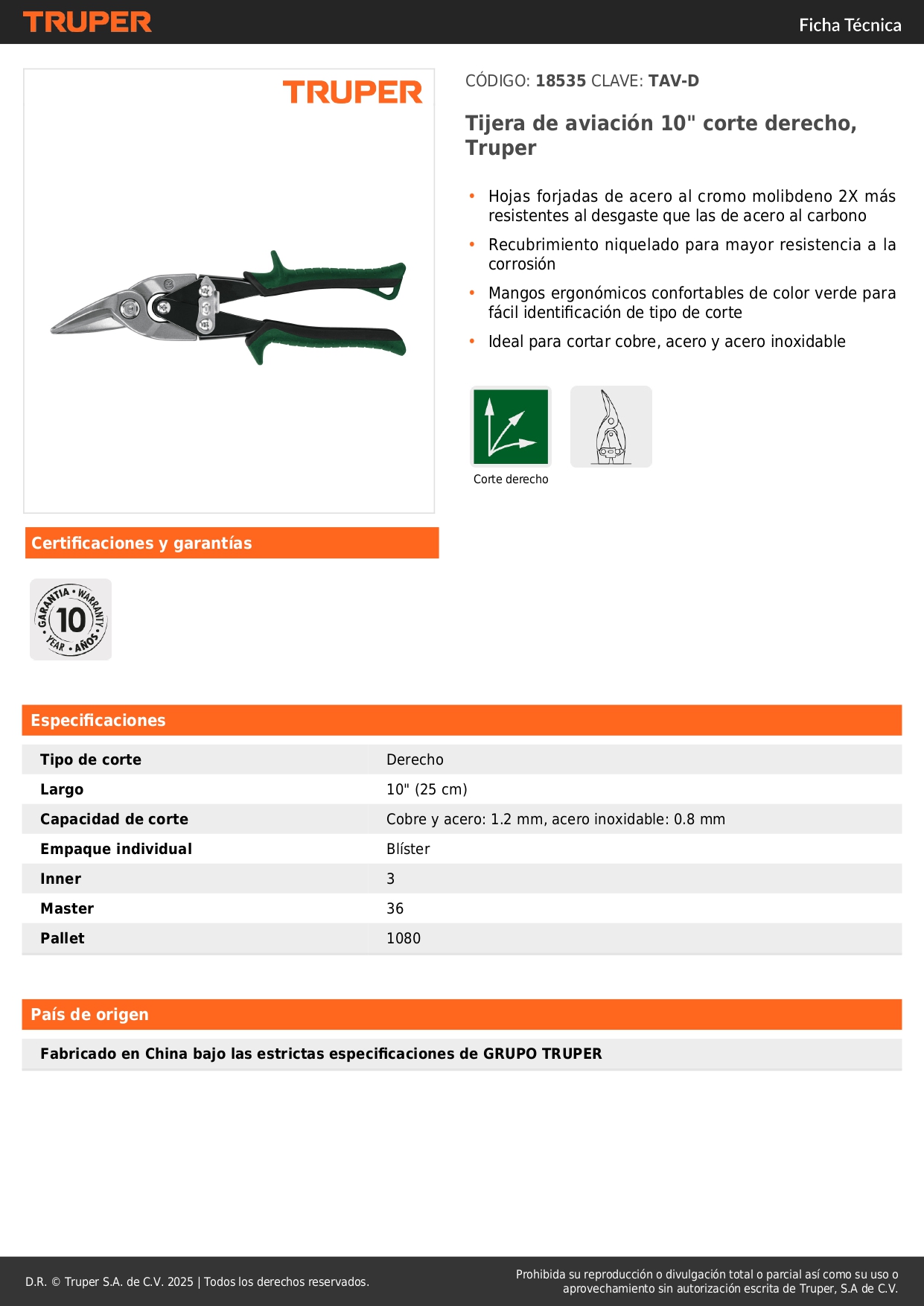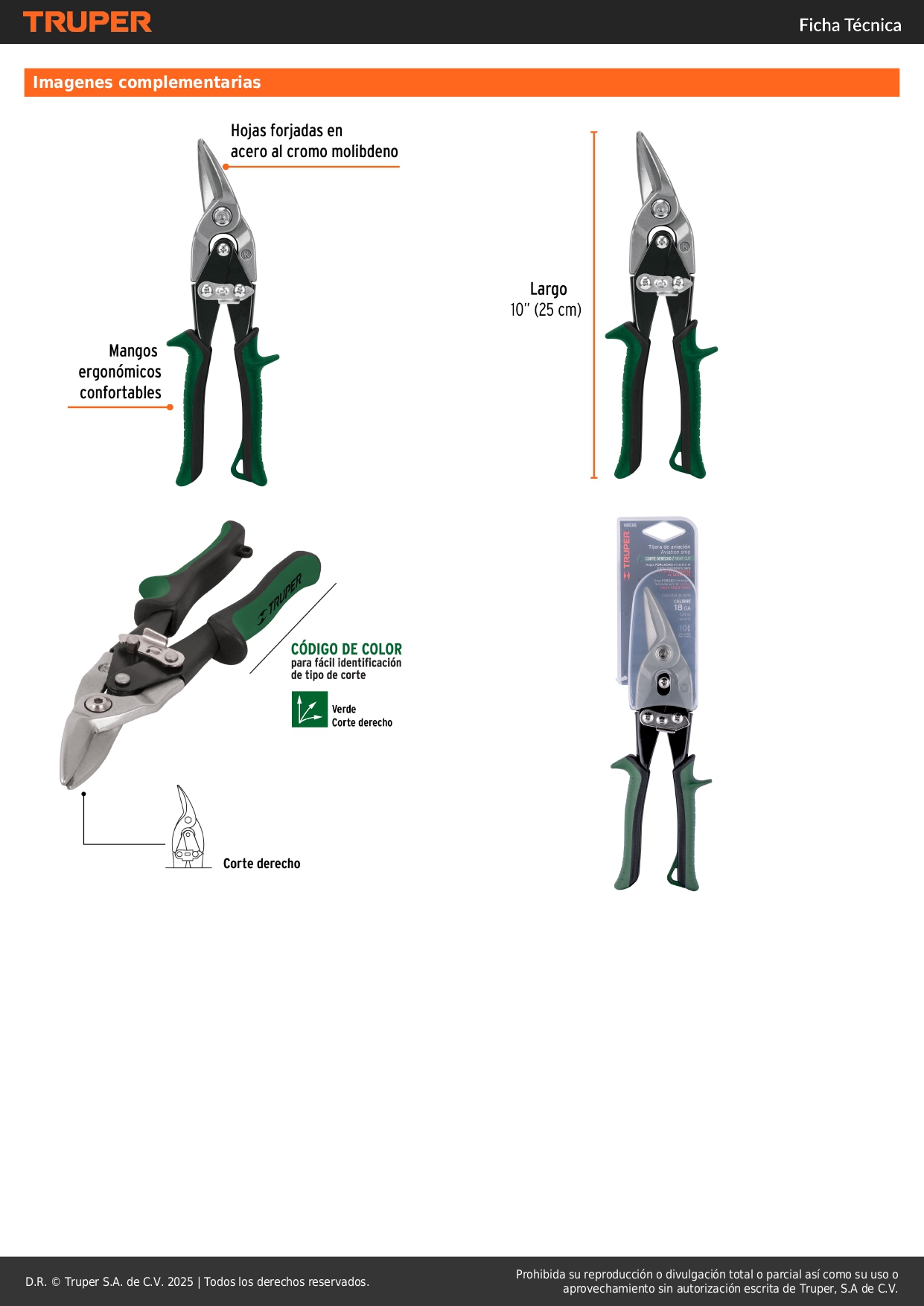 Tijera de aviación 9 1/2´´ corte derecho, Truper