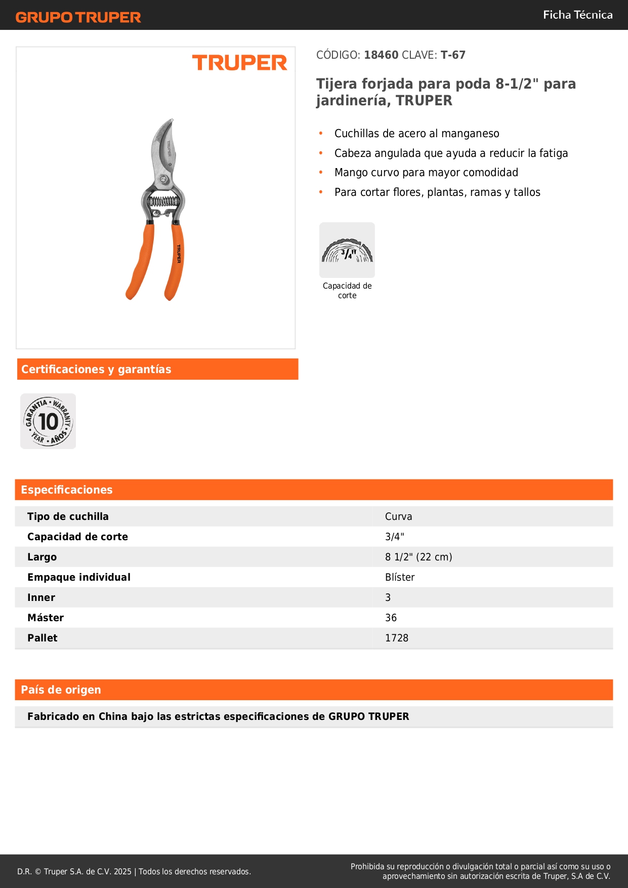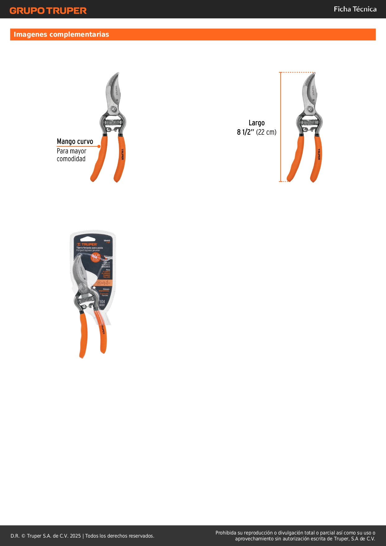 Tijera para poda 8" forjada cuchilla paso cabeza angulada Truper