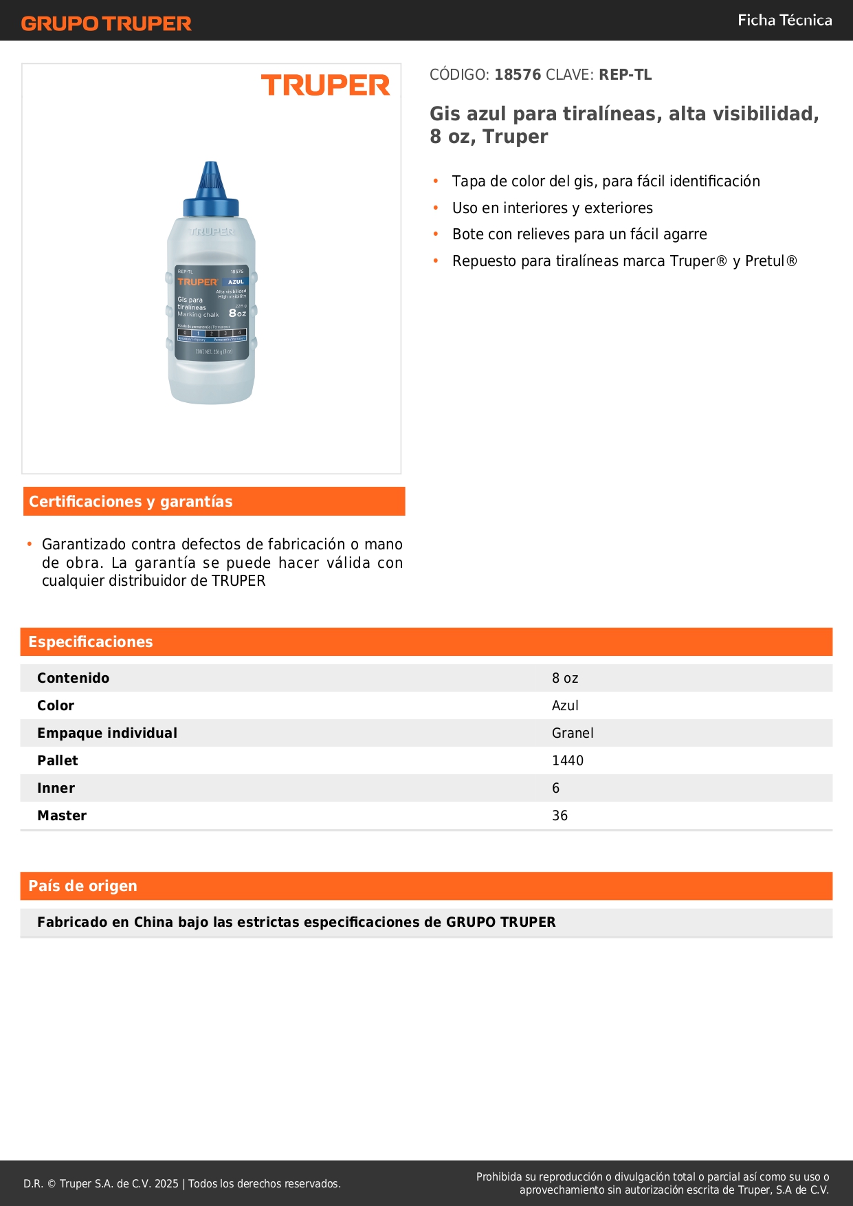 Tiza azul para tiralíneas, alta visibilidad, Truper