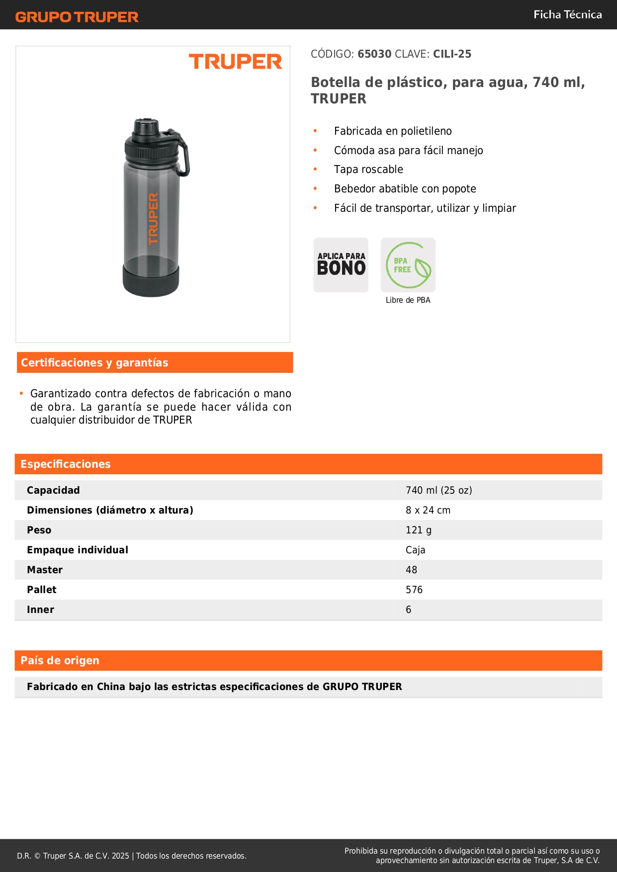 Botella de plástico, para agua, 740 ml, TRUPER