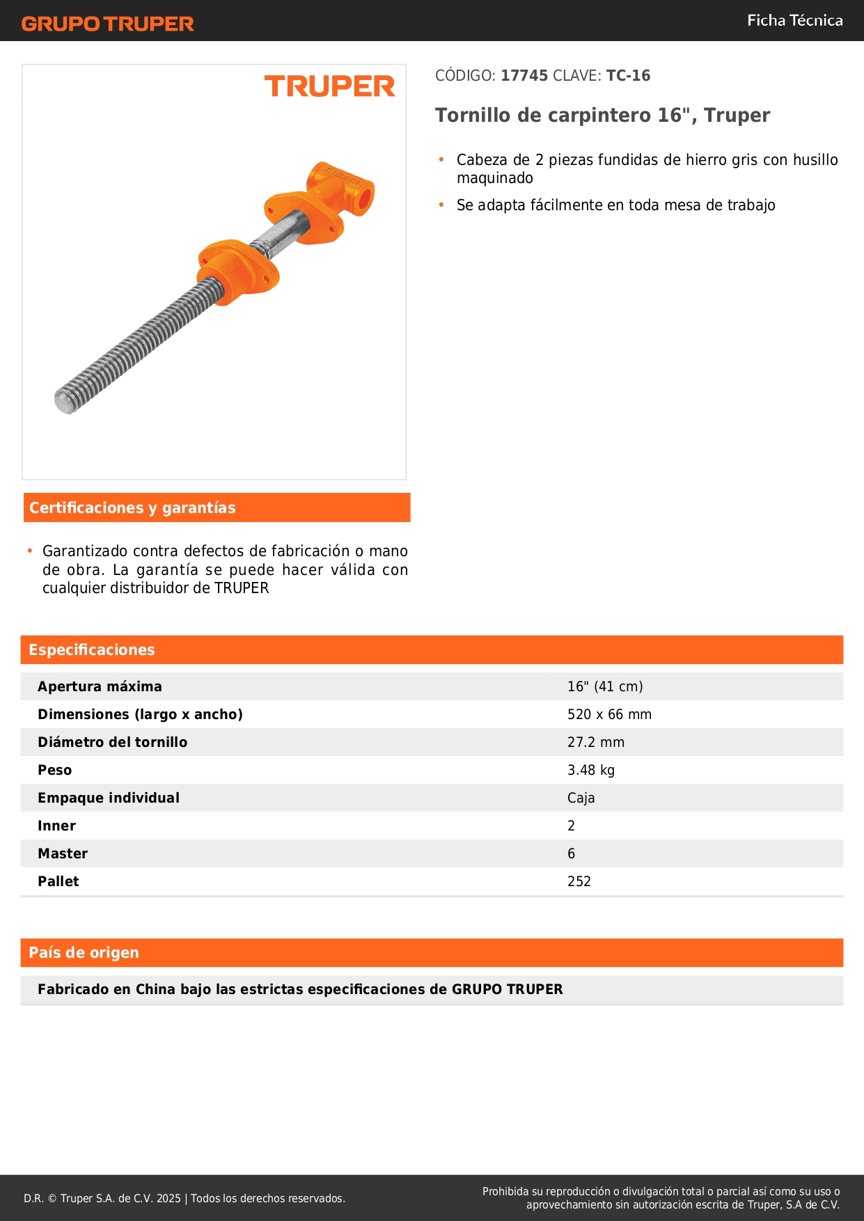 Tornillo De Carpintero 16" Truper