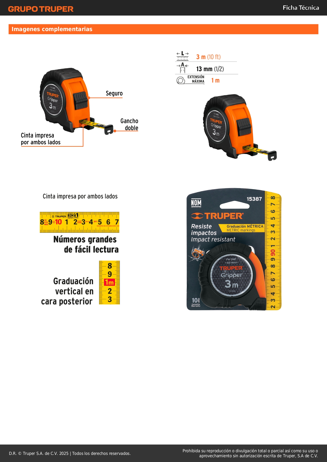 -Cinta impresa por ambos lados, recubierta de laca para máxima duración (Números grandes de fácil lectura / graduación métrica horizontal y vertical)