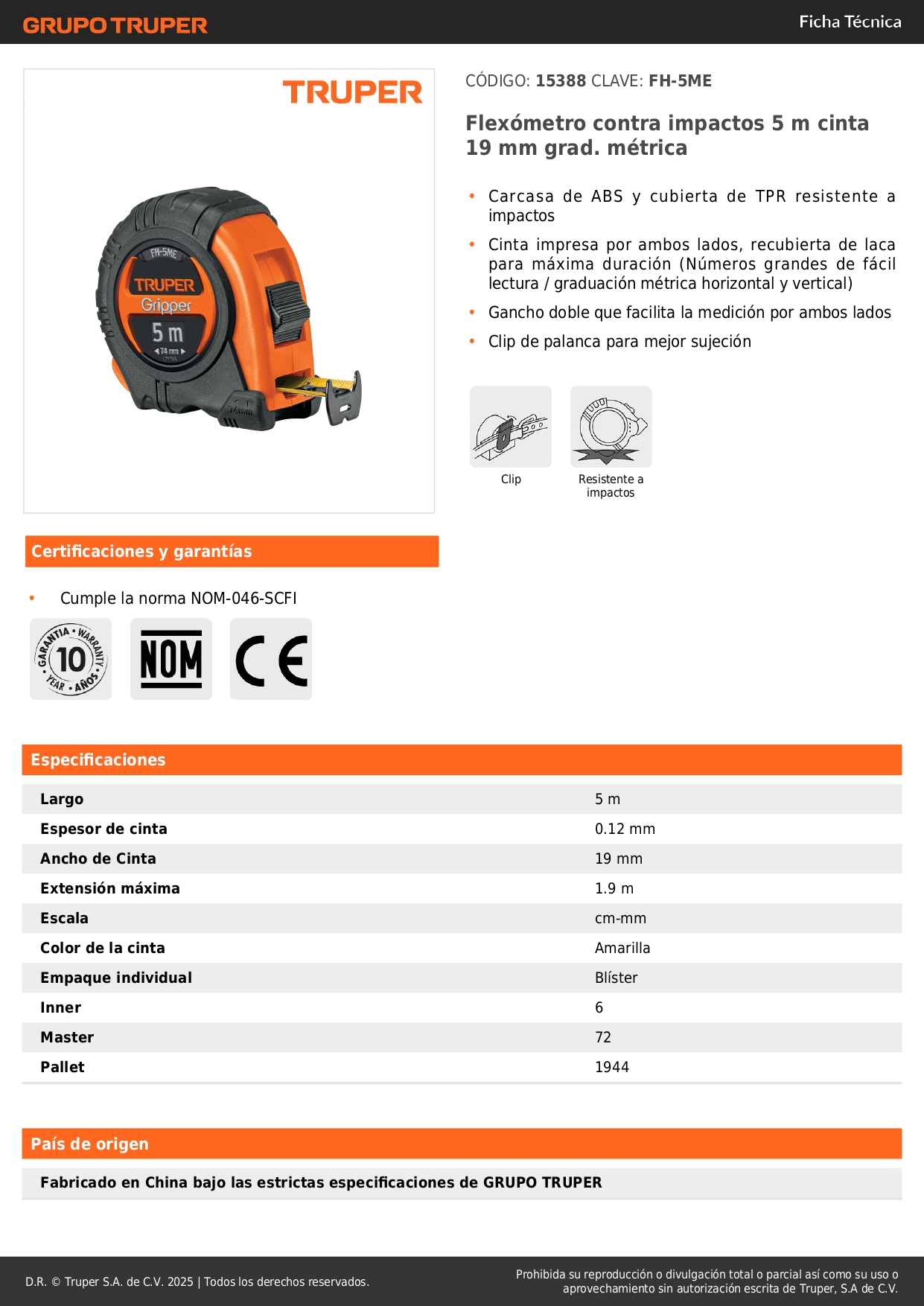 Wincha contra impactos 5 m cinta 19 mm grad. métrica. truper