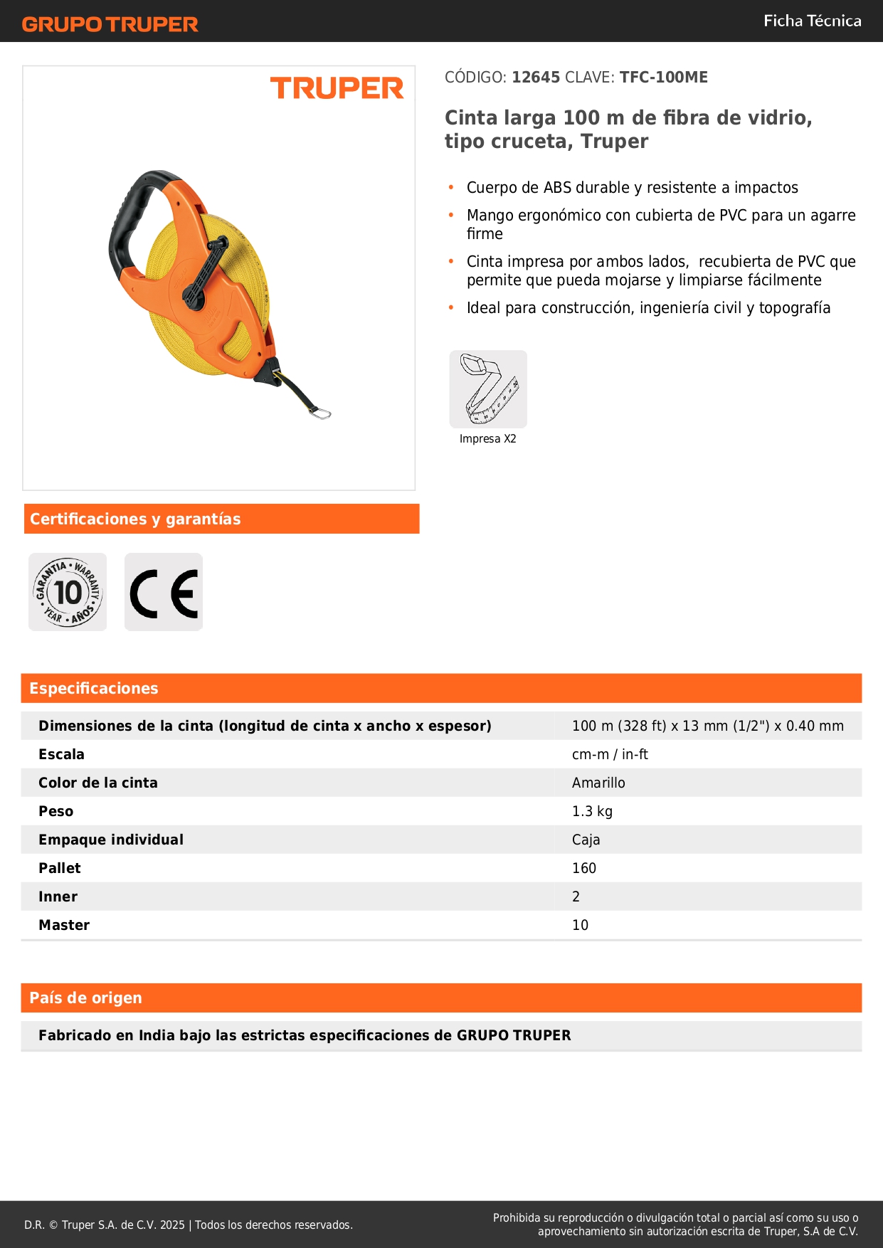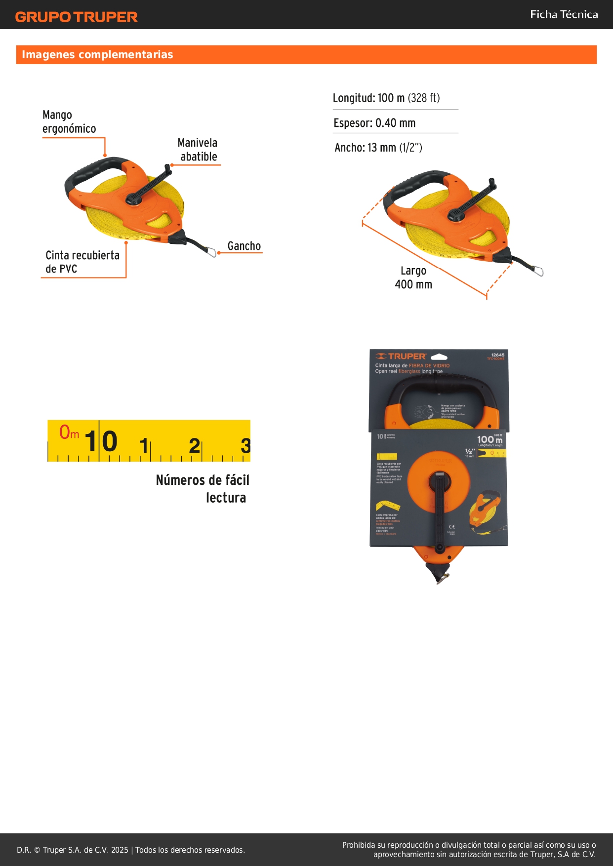 Wincha de fibra de vidrio de 100 m tipo cruceta Truper