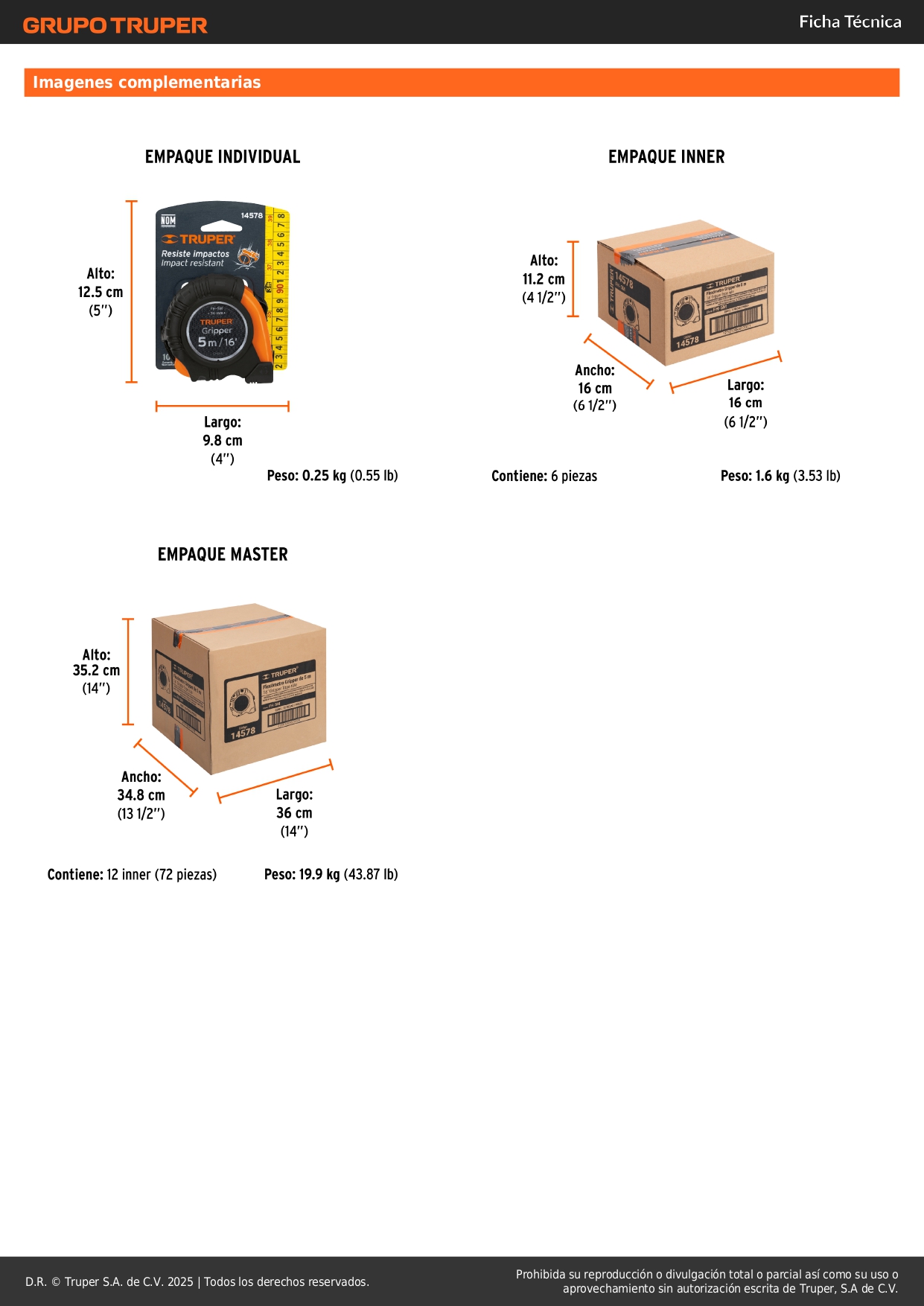 Dimensiones de la cinta (largo x ancho x espesor) 5 m (16 ft) x 19 mm (3/4") x 0.12 mm