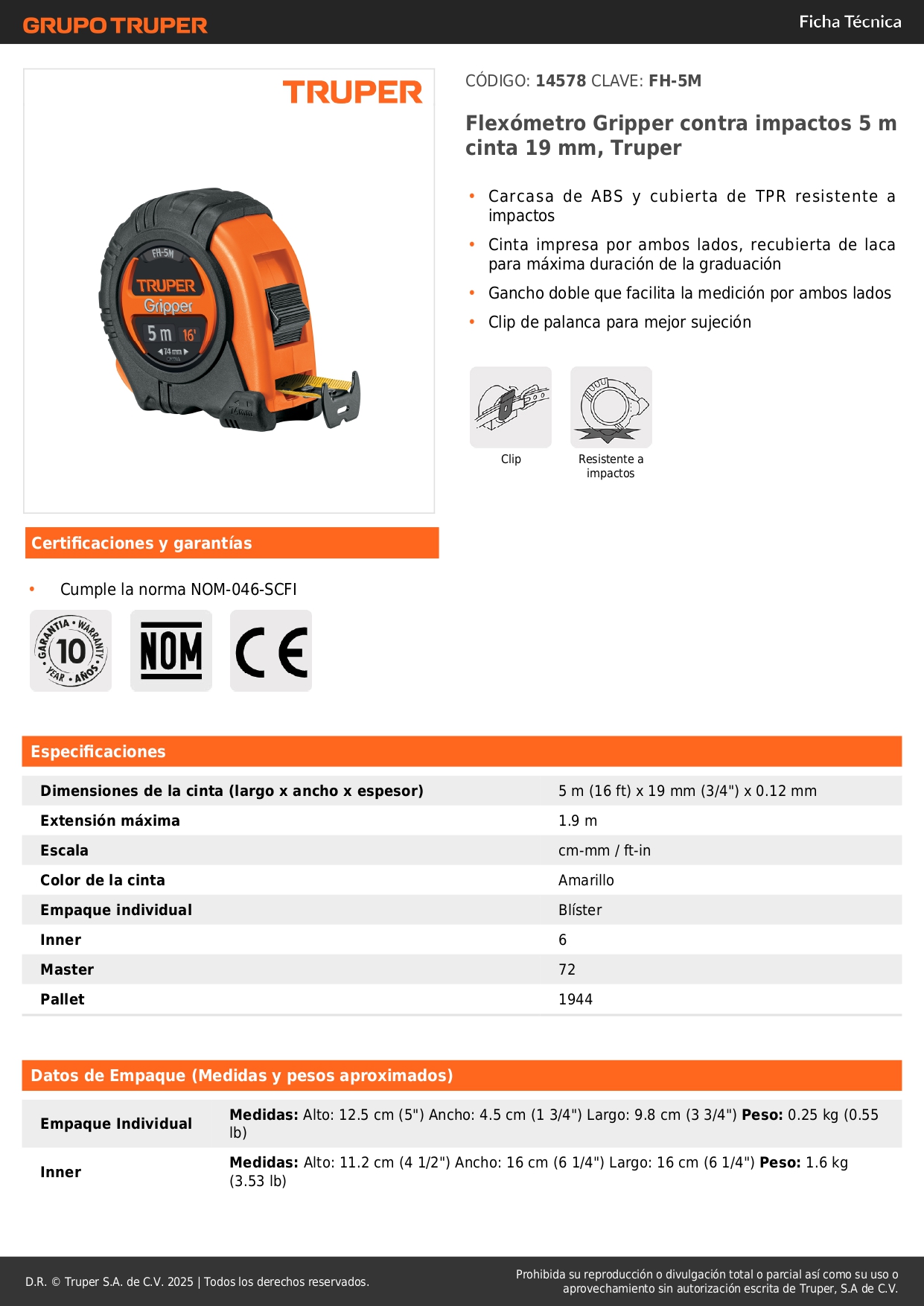 Flexómetro Gripper contra impactos 5 m cinta 19 mm, Truper